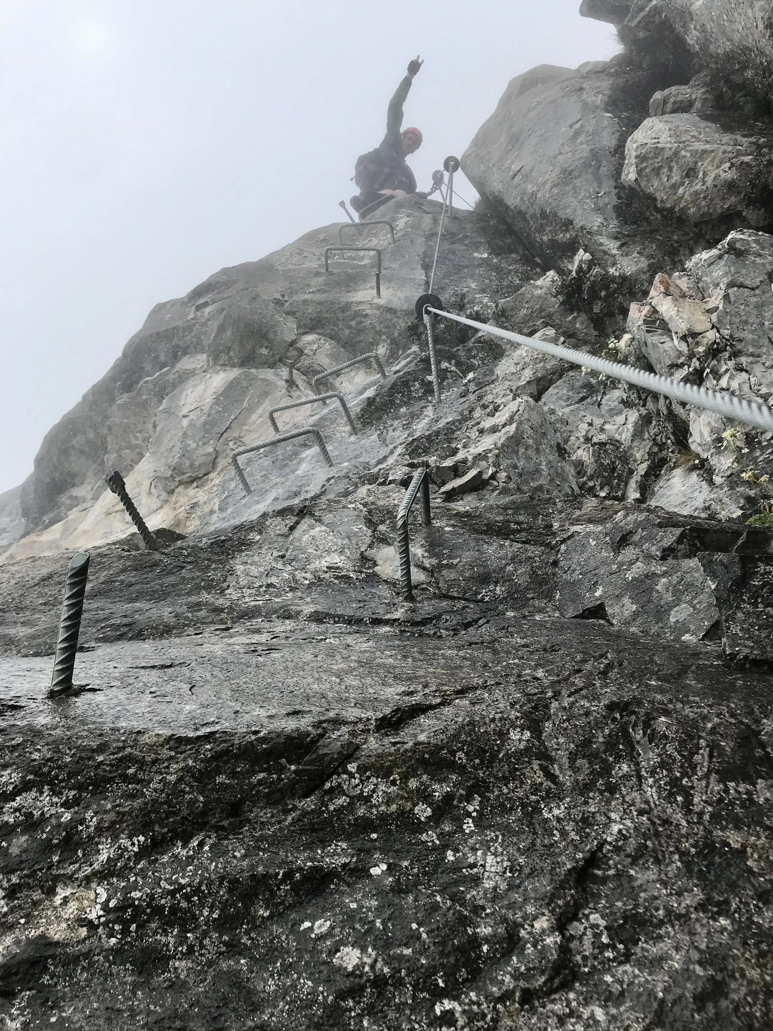 That morning the rock was wet. Swiss via ferrata routes place fewer holds than elsewhere in the Alps, leaving climbers to rely on rock rather than metalwork for grip. This is one thing in the dry but we climbed inside a cloud over wet rock and I wore black running shoes so flimsy they resembled plimsoles. Within minutes I slipped and cut my knee on the gneiss. My blood mixed with water on the rock.